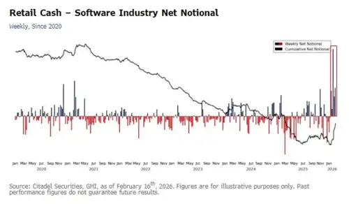 У більш широкому сенсі, середньодобовий попит з боку фізичних осіб на акції США в період з 2 січня по 13 лютого був приблизно на 25% вищим, ніж попередній рекорд 2021 року , і навіть вдвічі перевищив середній показник, що спостерігався між 2020 і 2025 роками. Іншими словами, дрібні вкладники повернулися на ринки, і вони вкладають гроші з помстою.