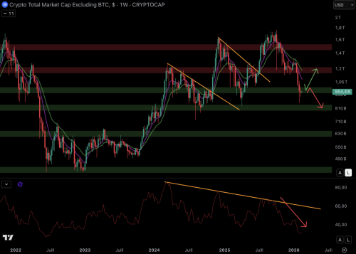 Ціна біткойна вже кілька місяців перебуває у фазі корекції , тягнучи за собою вниз альткоїни. Ринкова капіталізація альткоїнів знизилася приблизно на 50% з піку , але поки що їй вдалося стабілізуватися близько тижневого рівня підтримки в 980 мільярдів доларів . Незважаючи на негативне тижневе закриття BTC, ринкова капіталізація альткоїнів тримається вище цього рівня підтримки.