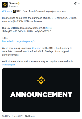 Після здійснення початкової покупки біткойнів на суму 100 мільйонів доларів за допомогою стейблкоїнів фонду SAFU у доларах США 2 лютого 2026 року платформа Binance повторила операцію 4 лютого, здійснивши другий транш конвертації стейблкоїнів у BTC на ту ж суму.
