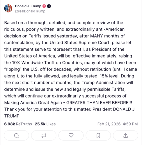 «Після ретельного та всебічного розгляду вчорашнього абсурдного, погано складеного та глибоко неамериканського рішення Верховного суду Сполучених Штатів щодо тарифів, а також після багатьох місяців обговорень, я хочу заявити, що як президент Сполучених Штатів Америки я негайно підвищу глобальний 10% тариф, що накладається на країни, багато з яких десятиліттями (доки я не прийшов до влади!) безкарно експлуатували Сполучені Штати, до повністю дозволеного та юридично підтвердженого рівня 15%».