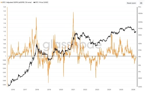 Скоригований коефіцієнт прибутку від витрачених коштів (aSOPR) вище 1 сигналізує про бичачий імпульс для біткойна. Таким чином, король криптовалют перебував у позитивних умовах між 2023 і 2025 роками. Але у 2026 році спостерігається зміна тренду, коли aSOPR падає нижче 1 .