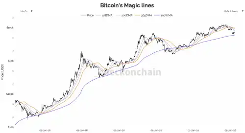 Згідно з попереднім індикатором блокчейну, позитивних сигналів немає. А «Магічні лінії» біткойна , які поєднують кілька ключових ковзних середніх, не підвищать моральний дух інвесторів. Дійсно, ціна біткойна торгується нижче 128-, 200- та 365-денних ковзних середніх .