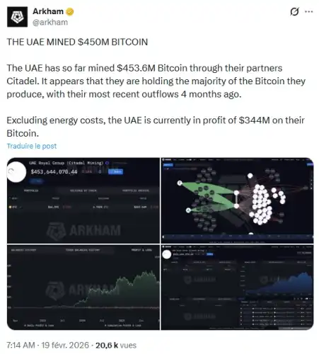Як зазначено в повідомленні Arkham Intelligence на X, опублікованому 19 лютого 2026 року, Об'єднані Арабські Емірати зараз володіють загалом 6 786 BTC , що еквівалентно майже 454 мільйонам доларів за поточною ціною біткойна .