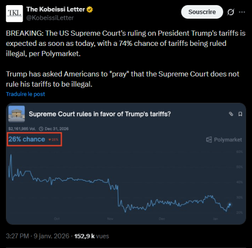 Гравці на полімаркеті оцінюють ймовірність того, що Верховний суд визнає недійсними тарифи Трампа, у 74% – Джерело: Account X