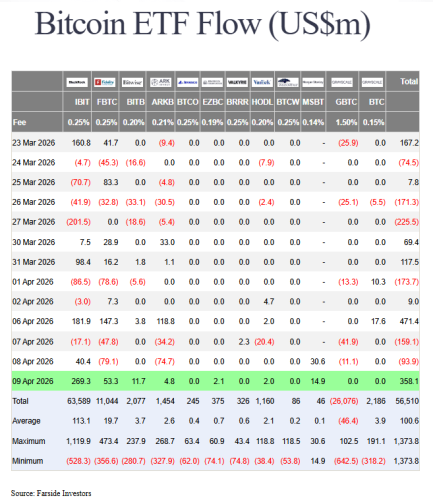 9 квітня 2026 року загалом був дуже вдалим торговим днем для 12 біткойн-ETF, що котируються на американських біржах. Загалом лише цього дня ці фінансові продукти залучили понад 358,1 мільйона доларів чистого притоку.