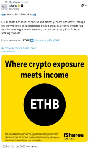 Зокрема, у прес-релізі, опублікованому в четвер, 12 березня 2026 року, BlackRock оголосила про завершення процесу регулювання з Комісією з цінних паперів та бірж США, щоб мати змогу запропонувати свій другий ETF Ethereum за готівку, цього разу з інтегрованим стейкінгом ефірів фонду.