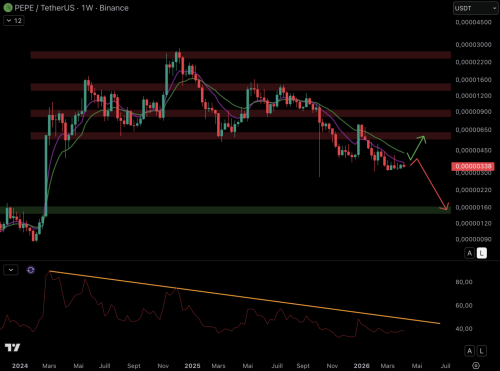Відскок може призвести до повернення до рівня опору $0.0000065 , але цей рівень, ймовірно, буде важко пробити. Якщо ціна продовжить зупинятися між ковзними середніми, можливе падіння до рівня підтримки $0.0000016 . RSI слабкий ; він торгується нижче лінії тренду вже кілька місяців.