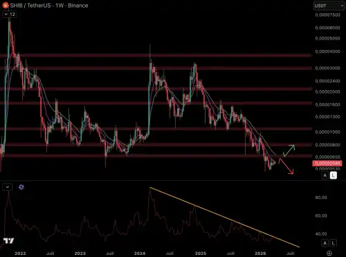 Індекс SHIB демонструє низхідну траєкторію, при цьому продавці контролюють ситуацію . Ціна дещо відскочила, але продовжує зупинятися на тлі ведмежих ковзних середніх (9-денна/18-денна EMA) .