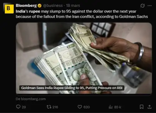 Ескалація напруженості між Іраном та всім регіоном спричинила значне зростання цін на нафту , які зросли майже на 40% з кінця лютого. Оскільки Індія імпортує приблизно 85% своїх потреб у вуглеводнях, це зростання цін автоматично погіршує поточний баланс країни та збільшує тиск на валюту .