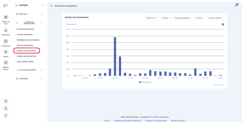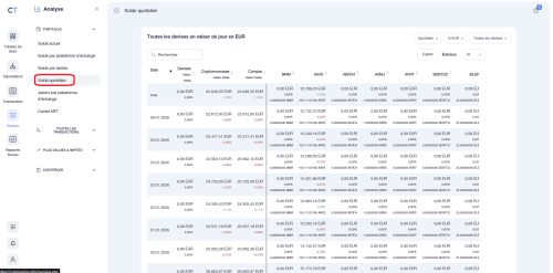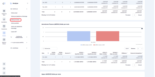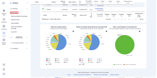 Там ви знайдете численні діаграми щодо ваших прибутків або збитків, вартості кожної валюти, кількості ваших токенів, обсягів транзакцій… Вони інтерактивні: ви можете показувати або приховувати дані на свій розсуд, клацаючи на легенді, збільшуючи масштаб тощо…