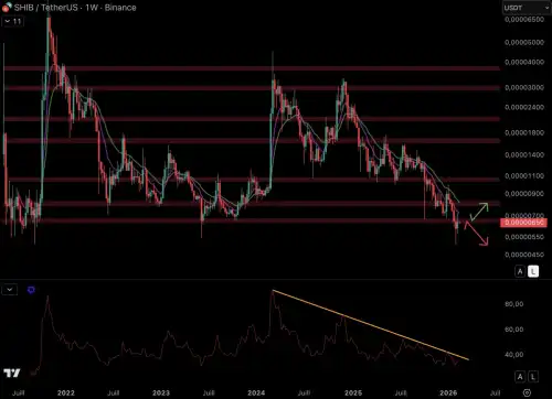 Індикатор імпульсу RSI повинен пробити ведмежу лінію тренду, щоб імпульс знову став бичачим на тижневому графіку SHIB.