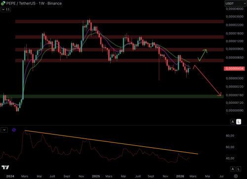 PEPE вже кілька місяців має низхідний тренд , і нещодавно втратив підтримку на рівні $0,000006 . Цей рівень навіть виступав опором.