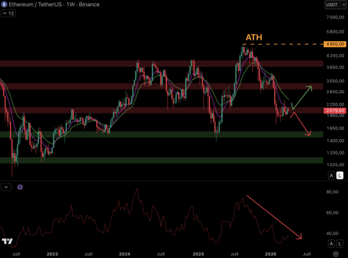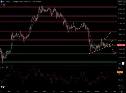 З початку лютого ціна Ethereum рухається за схожою схемою. Дійсно, ціна коливається в боковій площині навколо рівня опору $2100 , а ковзні середні (9-денні/18-денні EMA) діють як бар'єр.