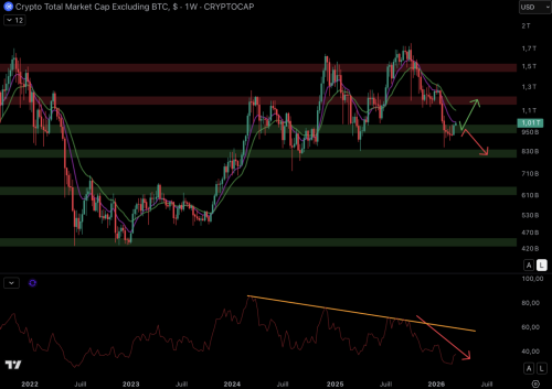 Якщо біткойн продовжить своє відновлення до $80 000 , ринкова капіталізація альткоїнів може зрости до рівня опору в $1,2 трильйона . Однак, якщо ціна буде відхилена проти низхідних ковзних середніх, можливе подальше падіння. Якщо продавці відновлять контроль, ціна може впасти до рівня підтримки в $810 мільярдів .