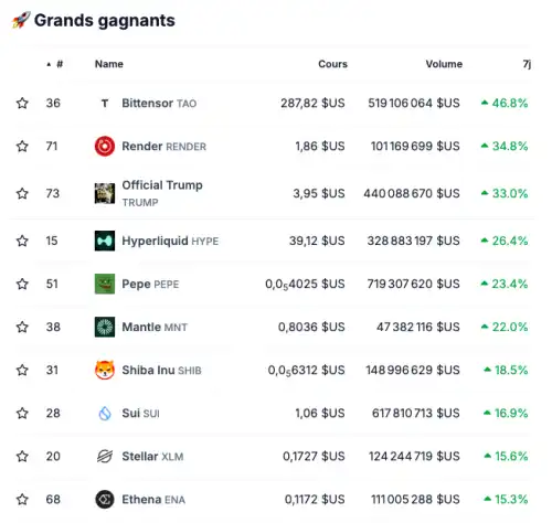 Акції Bittensor (TAO) продемонстрували найбільше зростання за останній тиждень, піднявшись майже на 50% . Render (RENDER) та Official Trump (TRUMP) також добре показали себе, з відскоками понад 30% .