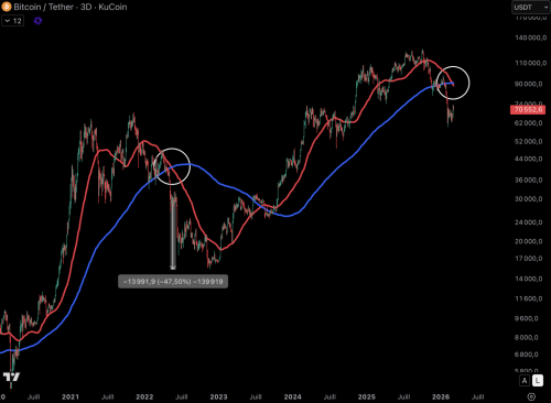 Ціна біткойна впала приблизно на 50% з моменту досягнення піку в 126 000 доларів у жовтні. Після значного падіння BTC намагається відновитися приблизно до рівня ціни виробництва. Таким чином, король криптовалют демонструє силу на тлі триваючого конфлікту між Іраном та Сполученими Штатами. Але чи закінчився вже ведмежий ринок? Не обов'язково. Щойно сформувався смертельно небезпечний хрест, і історично це запускає ведмежу фазу для біткойна. Ми пояснюємо все в сьогоднішньому бюлетені!