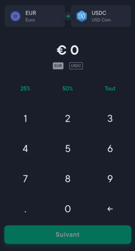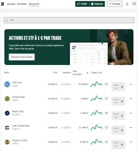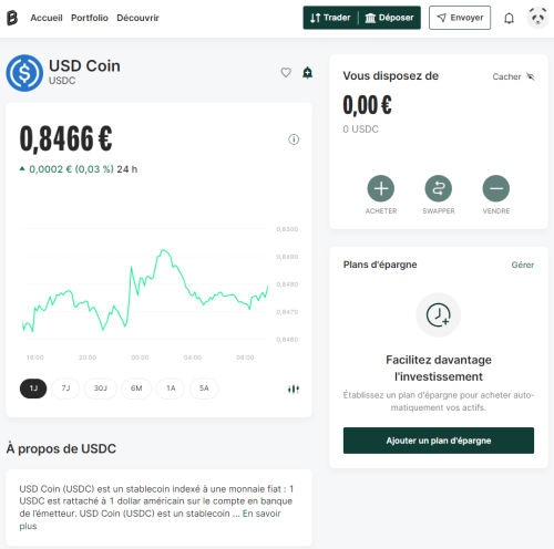 Далі введіть суму в євро, яку ви хочете інвестувати, або кількість стейблкоїнів, яку ви хочете купити. Нарешті, підтвердіть свою покупку, натиснувши синю кнопку «Купити». Транзакція відбувається миттєво, і актив з’являється у вашому гаманці.