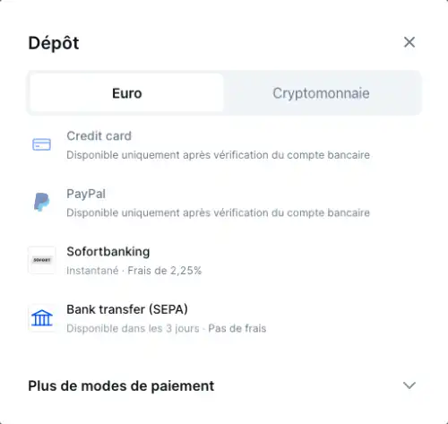 Натисніть синю кнопку «Депозит», поставте позначку у відповідному полі, щоб підтвердити вимоги, та виберіть «Банківський переказ (SEPA)» . Після першого переказу ви матимете доступ до інших способів депозиту , таких як кредитна картка або PayPal, а також до переказів криптовалюти.