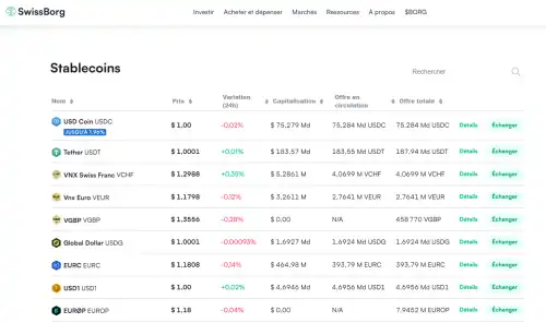 Після отримання коштів у вас буде можливість придбати кілька стейблкоїнів. Swissborg пропонує кілька варіантів, прив'язаних до долара, євро, швейцарського франка та британського фунта. Доступ до них можна отримати на вкладці «Стейблкоїни» на Маркетплейсі.