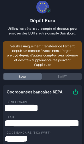 Ви можете здійснити переказ SEPA або SWIFT , а також, якщо ваш банк дозволяє, миттєвий переказ , який надійде до Swissborg менш ніж за 10 секунд. Ні, справді, це не жарт, слово Буссоле!