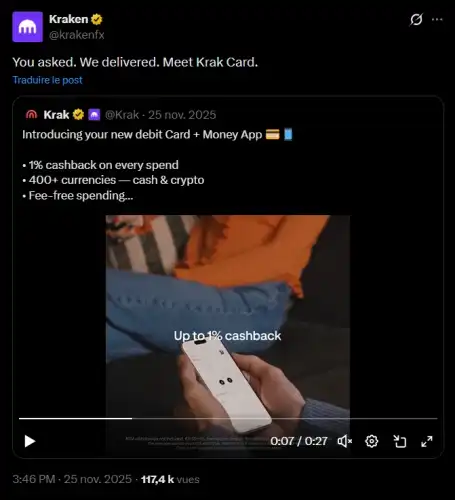 Ключова перевага цієї пропозиції полягає в системі кешбеку, яка забезпечує до 1% кешбеку, зарахованого в євро, британських фунтах або безпосередньо в криптовалютах. Ця функція дозволяє користувачам реалізувати пасивну стратегію DCA: кожна щоденна покупка, така як кава або бак бензину, генерує автоматичну винагороду, наприклад, у BTC. Таким чином, Kraken пропонує рішення, де кожна щоденна витрата сприяє довгостроковим заощадженням клієнта.