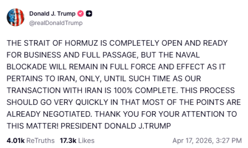 «Ормузька протока повністю відкрита та готова прийняти весь рух і дозволити вільний прохід; проте морська блокада залишатиметься в повній силі лише щодо Ірану, доки наша угода з Іраном не буде завершена на 100%. Цей процес має відбуватися дуже швидко, оскільки більшість пунктів вже узгоджено. Дякую за вашу увагу до цього питання!»
