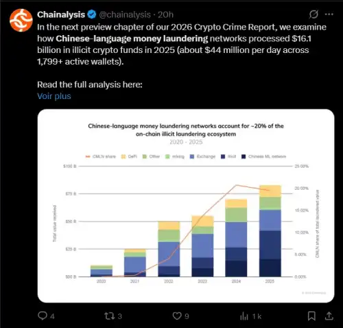 Темна сторона криптовалюти. Відмивання грошей, отриманих у криптовалюті, досягло промислового рівня . Згідно з останнім звітом Chainalysis, незаконні потоки зросли з 10 мільярдів доларів у 2020 році до понад 82 мільярдів доларів у 2025 році. В основі цього вибухового зростання: китайськомовні мережі відмивання грошей (CMLN), які зараз обробляють приблизно 20% світової діяльності з відмивання грошей в мережі.