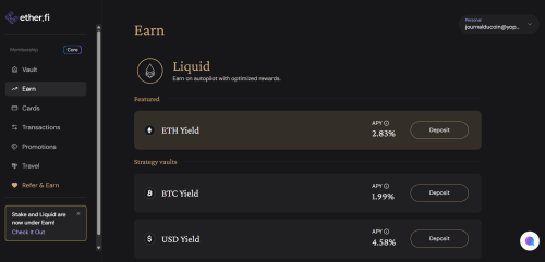 - Дохідність від залишків та застави: Незалежно від того, чи обираєте ви прямі витрати, чи позичаєте кошти, ваші кошти, що зберігаються у сховищі, є продуктивними. Вони генерують дохід навіть тоді, коли ви використовуєте їх для щоденних витрат. Ether.fi використовує різні протоколи кредитування/позичання, стейкінгу та надання ліквідності (Aave тощо) для досягнення цієї мети. Ви можете знайти деталі, натиснувши на відповідні токени в меню «Заробити».