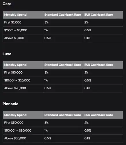Він розраховується поступово щомісяця, залежно від вашого рівня членства (див. нижче) та ваших загальних витрат. Для більшості транзакцій ставка починається з 3% для перших рівнів витрат, потім поступово знижується до 1% та 0,5%. Покупки, здійснені в євро, користуються скоригованими ставками, щоб компенсувати перевагу нульового обмінного курсу, з кешбеком 2% на першому рівні, потім 0,5% та 0,1%. Винагороди виплачуються безпосередньо в wETH (обгорнутий Ethereum).