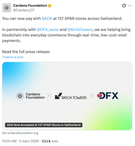 Саме на X фонд Cardano оголосив про гарну новину: інтеграцію блокчейну Cardano в платформу DFX.swiss , що, зокрема, дозволить здійснювати оплату рідною криптовалютою мережі, ADA , у 137 магазинах SPAR, розташованих у Швейцарії.