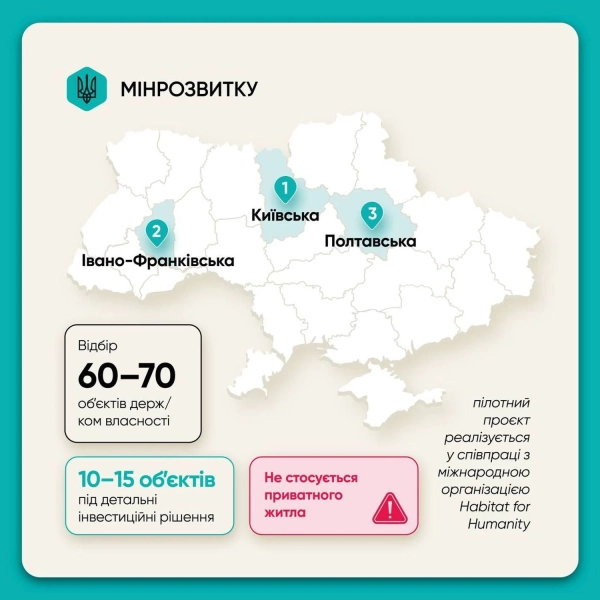 Слід зазначити, що проєкт впроваджується на виконання Закону України №4080-IX, який передбачає додаткові інструменти забезпечення ВПО житлом. На початковому етапі заплановано пілотний проєкт у трьох областях: Київській, Івано-Франківській та Полтавській. Зараз триває відбір 60–70 об’єктів, з яких для підготовки докладних інвестиційних рішень мають відібрати 10–15 – там, де реконструкція є технічно та економічно виправданою.