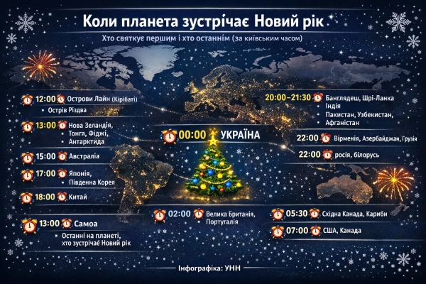 Святкування Нового року на земній кулі охоплює майже 24 години. Першими вітають рік, що наступає, жителі островів Лайн в Тихому океані, а останніми – мешканці Самоа. УНН підготували для вас добірку інформації про те, о котрій годині різні держави планети увійдуть у новий 2026 рік.